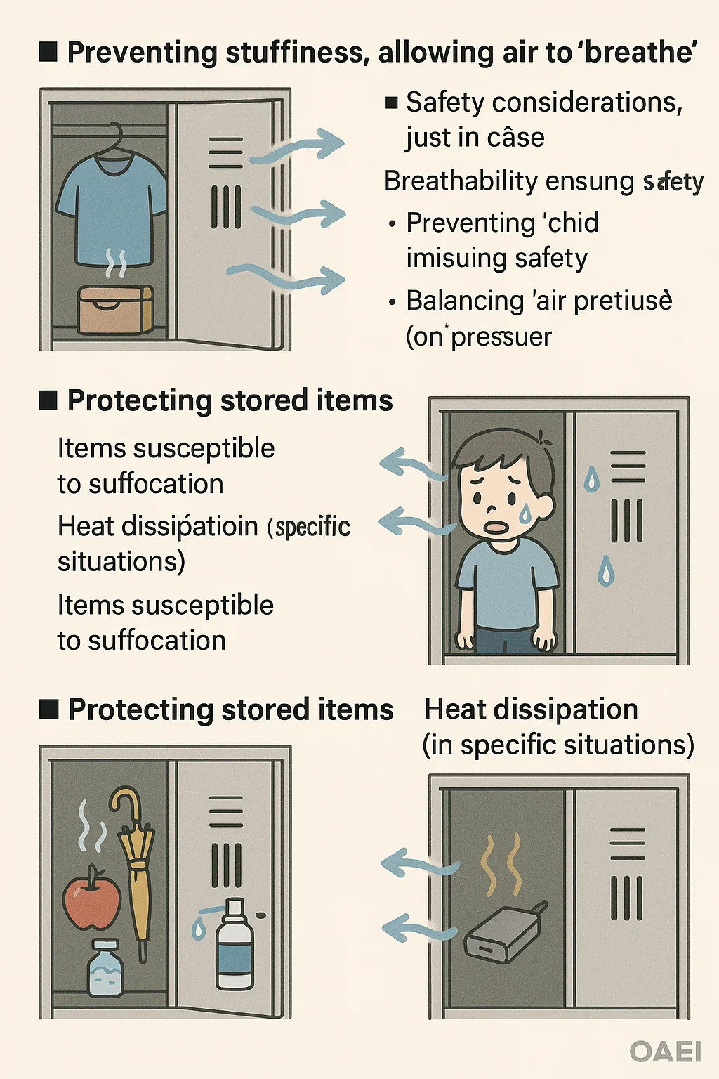 La respirabilité garantit la sécurité (l'une des raisons les plus importantes) : c'est crucial ! Dans le cas où un enfant se comporte mal ou s'enferme accidentellement à l'intérieur du casier (bien que cela soit rare, il s'agit d'une considération de conception), ces petits trous assurent la circulation de l'air et évitent l'étouffement. Un espace complètement scellé et sans trous est extrêmement dangereux.